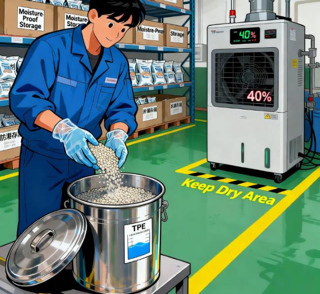 Por ser um material polimérico, as matérias-primas TPE são altamente sensíveis à umidade ambiental. Eles absorvem prontamente a umidade do ar durante o armazenamento ou transporte, levando à degradação das propriedades do material, dificuldades de processamento e até mesmo ao comprometimento da qualidade do produto final. O gerenciamento eficaz da umidade para materiais TPE requer uma abordagem multifacetada que abrange o controle do ambiente de armazenamento, métodos de embalagem otimizados e medidas de proteção suplementares.